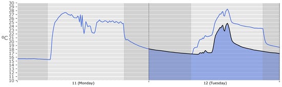 Measured temperature (blue line) and free oscillation temperature (black line) of thermal zone 14. Office building, School of Architecture (University of Navarra), 11–12 December 2017.
