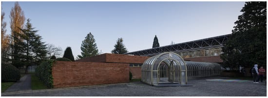 This methodology has been tested using a case study, the office building of the School of Architecture of the University of Navarra in Pamplona, Spain (see Figure 3), designed by the architects Carlos Sobrini, Rafael Echaide and Eugenio Aguinaga. This building of the 1970s is characterized by the use of simple materials (red bricks, simple-pane windows, concrete pillars, etc.). The façade is composed of two layers of brick 12 cm thick (interior and exterior) and with an insulation of mineral wool inside the chamber. The roof is formed (from inside to outside) by a dropped ceiling, concrete slab (30 cm), a waterproofing membrane, expanded polystyrene (EPS) foam insulation (12 cm), geotextile membranes and gravel (20 cm). The windows are simple-pane without a thermal bridge break. The building is protected from the wind by the School of Architecture on the north side and by a wall of red bricks in all the other orientations. It is fully monitored with temperature sensors in all the spaces (Onset-HOBO ZW-006 with TMC6-HD, TMC20-HD and TMC50-HD (Onset, Cape Cod, Massachusetts, US)), non-invasive sensors (YHDC SCT013 (Beijing Yaohuadechang Electronic CO LTD, China)) for the electric radiators and an energy meter (Kamstrup Multical 602, (Kamstrup A/S, Skamderborg, Central Jutlandia, Denmark)).
