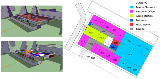 The calibrated model has been realized using OpenStudio (v. 2.6.0) and EnergyPlus software (v. 8.9) [11,55]. Figure 4 shows different views of the model (by surface type and thermal zone) and the 25 thermal zones into which the building energy model (BEM) is divided, where the colors represent the uses of the different thermal zones. The entire model has a surface of m2.