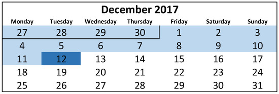 To test the methodology, real weather data for the year 2017 taken from an in situ weather station was used (Data Logger Hobo RX3003 (Onset, Cape Cod, MA, USA), Temperature/Relative Humidity Smart Sensor S-THB-M002 (Onset, Cape Cod, Massachusetts, USA), pluviometer S-RGF-M002 (Onset, Cape Cod, MA, USA), ultrasonic anemometer AO-WDS2E (HongYuv Technologies Co., Ltd., Chengdu, Sichuan, China) and a sunshine sensor BF5-SYS (Delta-T devices Ltd., Cambridge, UK)). For the temperature data of each thermal zone, the Onset-HOBO network of around 40 sensors provided the information. The selected day for performing MPC was 12 December 2017 because it was a very cold day after a week with three public holidays and the building had a very high energy demand. Figure 5 shows a calendar where the blue color represents the selected MPC day and the light blue color the days of thermal history needed to ensure that the model has captured its own thermal dynamic. Other studies like that developed by May-Ostendorp et al. [23] run the model through a period of a week to preserve the thermal history of the building; Corbin et al. [14] analyze the number of days that the energy model needs to stabilize its loads, highlighting that similar analysis “must be conducted to establish the length of thermal history required by each model”. In our case study, due to the previous public holidays, two weeks have been selected.