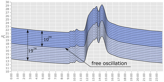 In this section, we seek to show how the search space affects the convergence time of the algorithm when working with a detailed energy model in an MPC optimization environment. To achieve this, we consider two experiments. In the first, the free oscillation curve is in the middle of a set of values (Figure 6). The distance between each line is C. An upper/lower limit of C is considered, respectively. The time horizon will always be 24 h, which makes a search space of . In the second experiment, the evaluation of set-point values under the free oscillation curve (winter) has no physical sense; therefore, these points can be eliminated from the search space, generating a reduced optimization problem of , as can be seen in Figure 6.