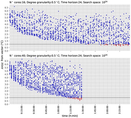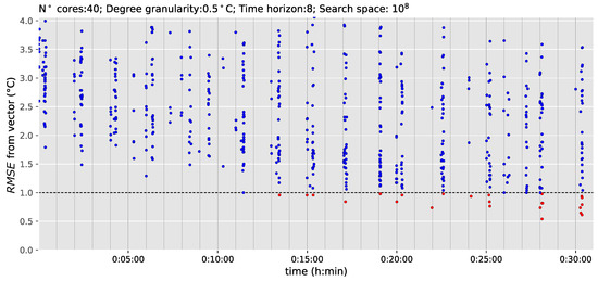 In Figure 7, the first experiment, with a search space of possibilities, is analyzed. This scenario was tested with both computers, the standard and the workstation. The genetic algorithm NSGA-II is configured with 200 generations of 16 individuals for the standard computer and 80 generations of 40 individuals for the workstation, depending on the number of threads. Both configurations perform around 3200 simulations because, in each generation, the software (jEPlus + EA v.1.7.7 [56]) does not duplicate elite solutions. The x-axis (abscissa) of Figure 7 shows the time and the y-axis (ordinate) calculates the from each vector (in degrees). Each blue dot represents the simulation of one possible solution, and, when the solution has an below C (horizontal dashed line), the blue dot changes to red. This allows the user to identify easily when the algorithm is obtaining reasonably good solutions. The optimization performed by the standard computer is at the top of Figure 7 and the workstation is at the bottom. As can be seen in both figures, the blue dots are grouped in vertical lines of 16 or 40 individuals. This is how the algorithm evolves the initial population over time, from generation to generation.
