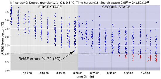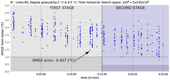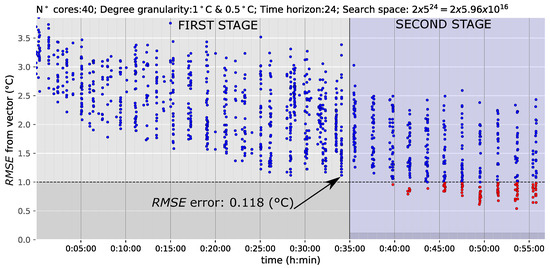 Figure 9 shows the optimization results obtained using these two stages across a 24-h time horizon. The left side of the figure represents the first stage and the right side the second stage, where 35 min was chosen as the time limit for the former. The darker zones on both sides represent the best solution that can be achieved in each stage. As has been noted, as the free oscillation values are not included in the first stage, the lower possible value for the is C. In contrast, in the second stage, the darker zone represents the minimum error of the best solution achieved in the first stage (indicated by an arrow). In this case, the best solution of the first stage has an of C, which is the height of the darker zone on the right side (the second stage). The results in Figure 9 show many solutions from the 40th min and the accuracy at the end is near C of . Thus, it is demonstrated that the approach is valid; the accuracy of the results obtained are similar to those obtained in Figure 8 and there is a convergence time reduction of more than 25 min.