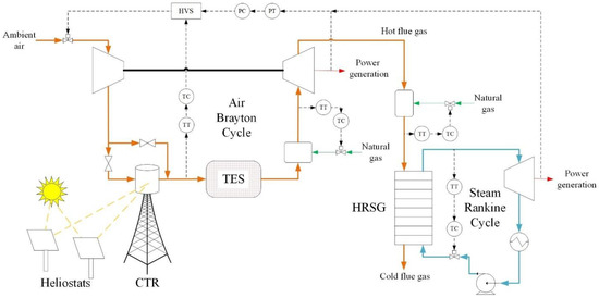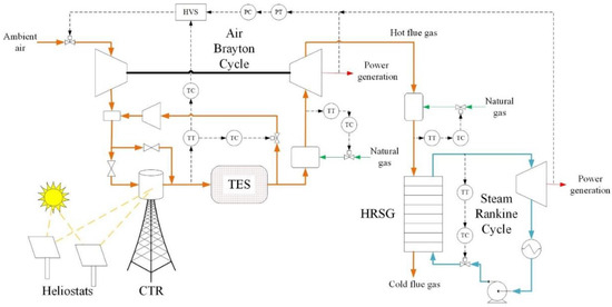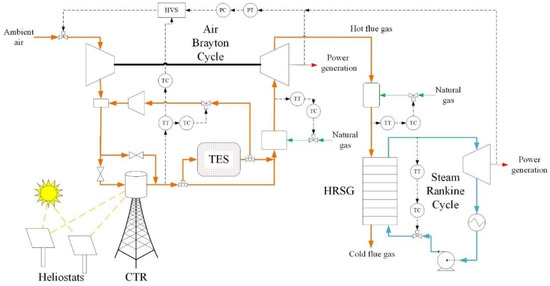 CSP can be easily hybridized with other energy sources, such as fossil fuels, due to equipment commonality. Through fossil fuel hybridization, the two energy sources operate in a synergistic way to produce power. This translates to more reliable operation of solar thermal plants, as well as increasing dispatchability of the converted energy to the grid during times of intermittent solar energy. Literature involving hybridization of CSP systems with natural gas is also quite abundant [6,16,17,18]. Hybridization offers an additional path forward to enhance solar energy utilization in CSP systems, as it has been shown to increase solar-to-electric efficiency (STE) relative to solar-only plants. STE is the marginal efficiency of converting available solar energy to electricity [19,20]. For a solar-only plant, plant operation may lower heat transfer and working fluid flow rates at times of lower solar activity so that the design temperatures can be met. Lower flow rates result in off-design operation and can lead to stagnation and dips in overall plant efficiency. For air turbine plants where air acts as both the heat transfer and working fluid, hybridization sustains turbine firing temperatures without having to lower the flow rate of the heat transfer fluid during hours of lower sunlight [19,21]. The sustained flow rates mitigate thermal losses in the solar collector and result in higher STE versus plants operating via only solar energy. Additionally, hybridization continuously maintains design temperatures during hours of intermittent solar activity or during delays caused by storage discharge. This steady temperature control further contributes to overall system performance and solar energy utilization [22]. A solar-tower, hybrid combined cycle plant has been proposed in literature [23,24,25] and a more common solar-tower Brayton plant has been developed at the pilot level [26,27,28] and modeled extensively [5,18,29]. Studies involving tower-driven plants have seen an increase in interest due to their high concentration ratios, which can realize the high operating temperatures needed to drive the Brayton cycle and combined cycle plants [14]. Both systems require temperatures greater than what PTC plants can realize, unless the integrated solar combined cycle (ISCC) is considered. Within ISCC systems, CSP compliments operation of the bottoming Rankine cycle, which can be realized using a PTC system [30,31].