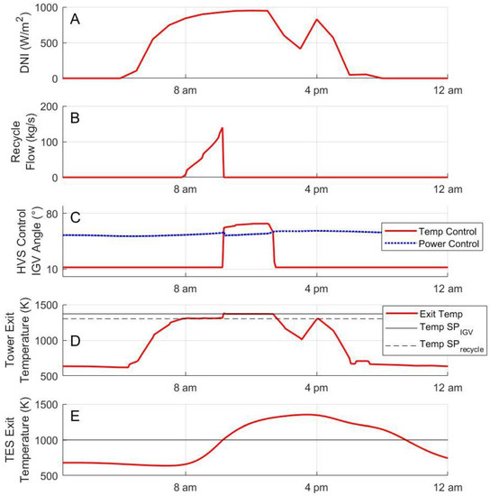 The operation of the base-case plant allows for some flexibility in plant operation, but at some point, the amount of solar energy input exceeds the thermal capacity of the air heat transfer fluid. This results in off-design temperatures within the receiver even with the HVS override. To mitigate this and to harness the excess solar energy utilizing the physical sinks in the system, a recycling configuration is proposed, as shown in Figure 2. Recycling increases the air flow and thus the thermal capacity of the heat transfer fluid in the receiver. This configuration presents a possible means to control CTR exit temperature as an alternative to redirecting excess solar energy to ambient heat (essentially losing solar energy). This solution to temperature control developed in this study is similar to previous research focusing on temperature control in parabolic trough systems through fluid flow manipulation [40]. Figure 4 shows the dynamics of the HVS-recycle control scheme for the recycling configuration. Initially, as direct normal irradiance (DNI) increases throughout the day (Figure 4A), the recycle stream (Figure 4B) turns on to control the receiver exit temperatures (Figure 4D) by increasing mass flow through the tower. Once the recycling temperature, or storage exit temperature, reaches 1000 K (Figure 4E), the recycle stream turns off. When the recycle loop turns off, the temperature control of the HVS may override the power control (Figure 4C) if the solar energy still available would result in temperatures higher than design conditions. The temperature setpoint of the recycle and HVS control loops, shown in Figure 4D, must be offset so that they do not interfere with one another; that is, the setpoint of the temperature from recycling is lower than the HVS control so that the HVS does not control collector temperature while recycling occurs.