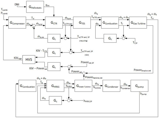 The hybrid solar-combined cycle plant has a capacity of roughly 200 MW between Brayton and Rankine cycles. Three configurations for plant operation are presented here (Figure 1, Figure 2 and Figure 3). The control scheme shown in Figure 1 is used as a basis for the plant. Ambient air is compressed and passed along to a central tower receiver (CTR) where a heliostat field directs concentrated sunlight to heat flowing air during hours of sunlight. When there is no solar activity, the air bypasses the receiver. Downstream of the collector, air passes through a packed-bed storage system. Then, the air passes through a combustion chamber and the hot flue gas is then directed to a gas turbine to produce power. The turbine firing temperature is controlled continuously by manipulating the natural gas flow into the combustion chamber. The net power of the plant is controlled by manipulating the inlet guide vane (IGV) angle of the compressor, which dictates air flow through the system on a volumetric basis. The IGV angle also controls the exit temperature of the CTR. Because the IGV controls both the receiver exit temperature and net power, a high-value selector (HVS) control is employed. The HVS continuously selects the highest IGV angle input between the power and CTR temperature control loops. The primary objective of the HVS controller is to maintain the power setpoint but it can override that setpoint, so collector temperature does not exceed design values.