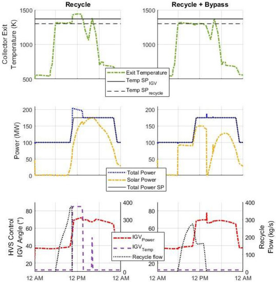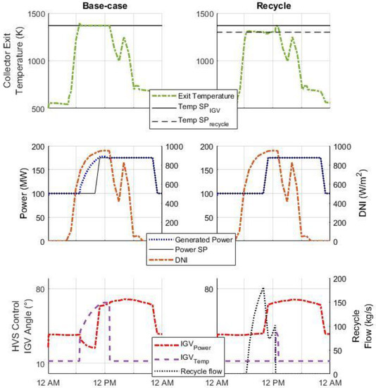 A major goal for this work is to develop an operation scheme with the associated control loops to maximize the solar fraction of the plant. This is achieved by employing systems-level control to reliably dispatch energy through hybridization and storage integration. As mentioned, previous work in the literature has focused on mirror orientation to maintain collector temperatures but through manipulation of air flow and leveraging the packed-bed TES, excess solar energy can be harnessed without having to direct solar energy away from the collector. The obvious means to increase solar fraction is to increase the heliostat field size and storage in accordance with the field. However, under the base-case configuration seen in Figure 1, during days of high solar activity, excess temperatures are sometimes realized even with the HVS override. In other words, the thermal capacity of the heat transfer fluid has been saturated relative to the amount of solar energy available, and the operating temperature exceeds the design specification. Figure 6 compares the dynamics of the base-case and the recycling configurations with respect to net power and temperature control. The plot also shows the manipulated variables for each control scheme and solar activity as a reference. As observed from Figure 6, the base-case configuration is able to maintain the temperature of the air leaving the tower using the HVS controller. However, because the IGV angle must increase to mitigate excessive temperatures during times of high solar activity, the power control is overridden, and the net power output increases accordingly, not allowing the plant to maintain power control.