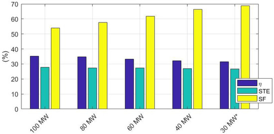 More drastic peaking schedules are also tested to potentially observe very high solar fractions. These scenarios are carried out via a parametric study at incrementally lower power sets point during non-peak hours following the peaking schedule, as previously mentioned. Initially, simulations ran with a field sized at 680,000 m2 and a 6-h TES. This size of field and storage corresponds to the same size of the components studied in Section 4.2. The off-peak power setpoint is decreased incrementally with values beginning at 100 MW and simulations are run at each of those power schedules for the day of June 24th. Lowering of the off-peak setpoint is continued until the plant was unable to maintain the power load due to the HVS-control scheme favoring temperature control over power. The plant performances are summarized in Figure 8.