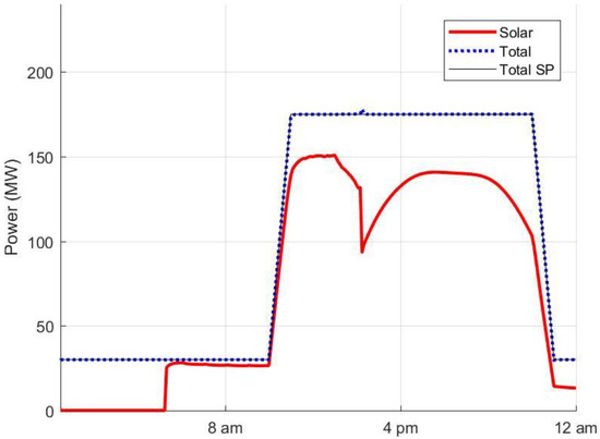 As seen in Figure 8, lowering the power setpoint during non-peak hours can significantly improve the solar fraction of the plant. Here, the plant exhibits a daily solar fraction greater than 65% when power is ramped down to 40 MW during non-peak hours. At a lower setpoint of 30 MW, the system could not maintain power setpoints and the HVS override was initiated. The setpoint of 30 MW is about as low as possible for modern-day power systems, which have been developed to operate at as low as 15% of capacity [53]. The results of that simulation still show a solar fraction approaching 70%, but at the expense of power control.