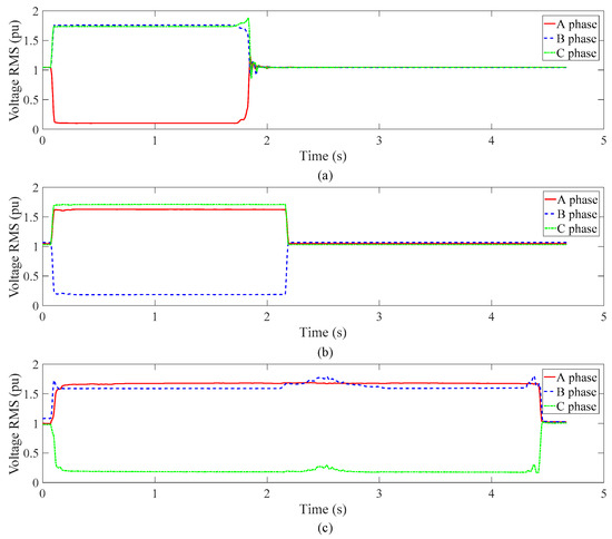 Typical waveforms of a two-phase short circuit. (a) Typical voltage RMS waveform of A- and B-phase short circuits; (b )typical voltage RMS waveform of B- and C-phase short circuits; (c) typical voltage RMS waveform of A- and C-phase short circuits.
