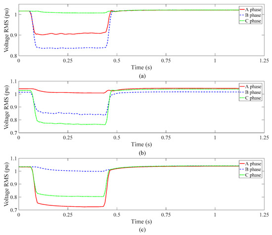 Typical waveforms of a single-phase short circuit. (a) Typical voltage root mean square (RMS) waveform of an A-phase short circuit; (b) typical voltage RMS waveform of a B-phase short circuit; (c) typical voltage RMS waveform of a C-phase short circuit.