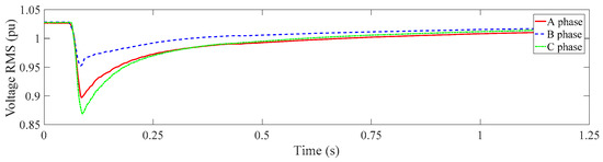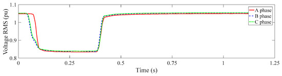 Short circuits represent a serious fault in a power system. Voltage sags are inevitably caused by the spread of short-circuit currents in adjacent lines. Sag degree and sag time are directly related to the fault type, fault location, monitoring point location, short-circuit impedance, and protection strategy. Finding the correlation between disturbance sources and the associated electrical characteristics is the basis for establishing a scientific and rational recognition model. Figure 1a–c shows the typical waveforms of the voltage RMS in the case of a single-phase short-circuit fault (A phase, B phase, and C phase, respectively). Figure 2a–c shows typical waveforms of the voltage RMS in the case of a two-phase short-circuit fault (A- and B-phases, B- and C-phases, and A- and C-phases). Figure 3 shows the typical waveforms of the voltage RMS in the case of a three-phase short-circuit fault.