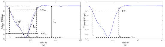 where and are the starting time and ending time of the voltage sag interval, respectively. In other words, and are the times when the voltage drops to 0.9 pu and recovers to 0.9 pu. An Rec value close to 1 indicates a highly rectangular sag waveform.