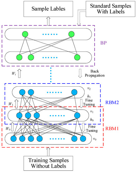In this paper, a contrastive divergence (CD-k) algorithm was used to determine the RBM parameters . The layer-by-layer training mechanism was used to train the visible layer and hidden layer of a certain RBM layer at a time, and the optimal parameters of this layer could be obtained. Moreover, feature extraction was completed on the current layer. Subsequently, the output data were continuously used as the input samples of the next RBM layer to be trained. The entire DBN was greedily trained layer by layer. A back propagation (BP) algorithm was used for parameter fine-tuning using some samples with category labels. Traditionally, the network weights and offsets are initialized using random values. In this paper, the weights and offsets were replaced by the weights obtained from the pre-training of the multilayer RBM. In this process, a BP network was set as a classifier on the top layer of the DBN. The output data of the RBM were the input of the BP network, and supervised training was executed to obtain the error. Then, the error was propagated from the top layer to every RBM layer to adjust the network parameters.