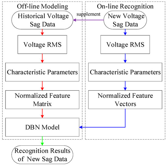 In this paper, the training and testing data were collected by an online monitoring system. When a voltage sag event occurred, the sampling data were recorded, and the characteristic parameters were calculated. Then, the DBN model was automatically established for classification and recognition. This model included two parts, an offline modeling module and an online recognition module. The offline module used historical data, and the online module used real-time data. The offline modeling module could realize the preprocessing and feature extraction of historical data and the training of the DBN. These raw sampling data were transformed into a feature matrix as a training set for the DBN. Then, the training of the DBN model was completed. In the online recognition module, new unrecognized sag data from the online monitoring system were processed to obtain the characteristic parameters, and these parameters were input into the DBN for recognition. The category labels of these new voltage sag data were obtained, and the recognition process finished. Furthermore, these new sag data were supplemented as the new training data for the DBN in the historical database, which was confirmed without errors. The recognition range and accuracy of the DBN network were continuously improved by repeated training. The basic modeling process is shown in Figure 8. The process is described in detail as follows: