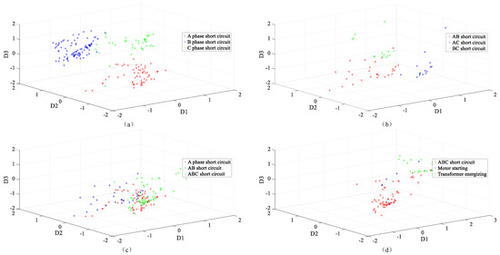 Separability connotes that, to achieve the classification objectives, the selection of features should follow certain principles. The features of different categories should be decentralized, and the features of the same categories should be congregated as far as possible. Features are the mathematical language that describe an event. Therefore, the feature data should contain as much information as possible about an event. Moreover, it is necessary to facilitate the establishment of a mathematical model. For appropriate voltage sag features, there are small spatial distances between features in the same categories and large spatial distances between features in different categories. In this paper, principal component analysis (PCA) was used to reduce the training samples from ten dimensions to three dimensions for display. Simultaneously, the average Euclidean distances of intraclass feature samples and interclass feature samples were calculated. Figure 9a–d shows the voltage sag feature distributions of A/B/C signal-phase short-circuit faults, AB/AC/BC two-phase short-circuit faults, A/AB/ABC-phase short-circuit faults, and three-phase short-circuit/motor starting/transformer energizing. These voltage sag features were extracted from sag data in the training set by PCA, and D1, D2, and D3 were three features of every sag sample. Table 2 shows the Euclidean distances of the features for different types of voltage sags.