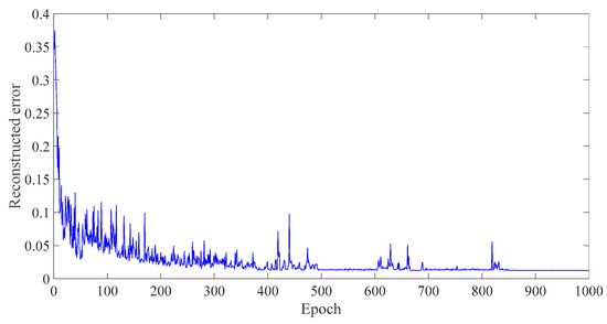In this paper, the deep learning model was built using the Deep Learn Toolbox master of MATLAB (R2016a, MathWorks, Natick, MA, USA). Because there were few input features, one hidden layer containing 100 neurons was established. There were 10 and 9 nodes in the first and last layer because there were 10 characteristic parameters and 9 types of voltage sag. The number of DBN training iterations was 50, the number of backpropagation neural network (BPNN) fine-tuning iterations was 1000, and the learning rate was 0.1. The input training samples of the DBN included 385 samples of 9 categories, and the sample format was . The output was the category labels. Figure 10 shows the global training error of the BPNN in fine-tuning reconstruction. The observed training error was stable and small after multiple iterations. Reconstructed error descended rapidly at the beginning of the iterations, which shows the satisfactory training effect. Then, 130 test samples were input into the DBN model, and the category label of each sample was obtained. The recognition results were shown in Table 3. There were four misclassified samples, and the overall recognition accuracy was 96.92%. Thus, the proposed model had high recognition accuracy in processing real voltage sag data.