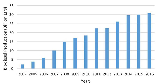 Extensive use of fossil fuels is causing environmental issues, i.e., global warming and pollution, and depletion of energy resources [1]. These challenges drive the quest for exploring alternative energy resources that can help in the reduction of fossil fuels consumption and environmental impact. Bioenergy is one of the viable alternatives that is shifting the paradigm from conventional fuels to more sustainable resources. Biodiesel is one of the major bio-based fuels, and a drastic increase in its production has been reported in the last two decades, as shown in Figure 1 [2,3]. Efficient design and operation of biodiesel production process are investigated to minimize the consumption of raw materials and utilities and also produce a high quality product. Data-based soft sensors are used to realize stable operation of the biodiesel production. The data-based soft sensors are more efficient than the model-based soft sensors in capturing the non-linearity of complex processes and prediction of desired outcomes; an extensive review on data-based soft sensors can be found in [4]. Their applications in the biodiesel production process include online prediction, optimization, and control.