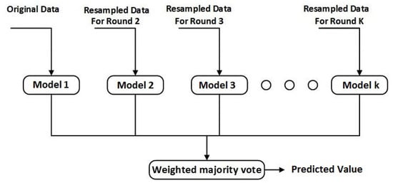 Boosting, which is an ensemble learning technique, is adopted in this study for the soft sensor development. Boosting is based on the idea of developing a robust model by combining several weak models [24]. The concept of boosting is demonstrated in Figure 3 [25]. The models are developed in a series of rounds where the focus on incorrectly predicted target samples is increased with the help of increasing their respective weight. Several boosting mechanism are developed on the basis of variation in their methods. Least Squares Boosting (LSBoost) was adopted in this study [26].