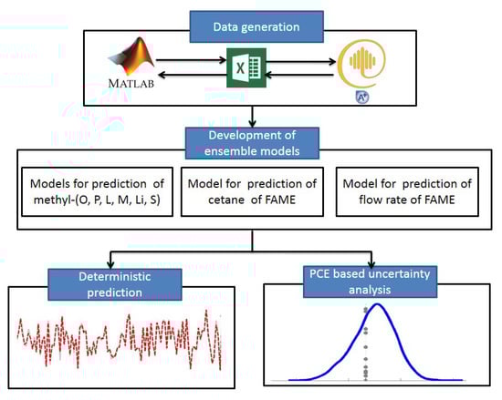 In this study, an integrated framework of data-based soft sensing and uncertainty analysis was proposed. Data-based soft sensors were developed using ensemble learning method, i.e., boosting, to predict composition, quantity, and quality of fatty acid methyl esters (FAME) in the outlet streams of biodiesel production process; cetane number of the FAME was used as a quality parameter. The cetane number relates to the ignition delay time of a fuel and is applied to alternative diesel fuels such as biodiesel and its components [23]. An increase in cetane number reduces the ignition delay period and stabilizes running of the engine. However, an excessive rise in cetane number causes too much reduction in the ignition delay. As a result, the fuel does not have proper time to spread into the combustion chamber and performance of the engine decreases. Prediction of composition helps in maintaining desired level of mole fraction of components while prediction of cetane number assists in realizing high quality of FAME. Prediction of quantity, i.e., flow rate, of FAME is important for evaluating conversion efficiency of the process. Polynomial chaos expansion (PCE) method was incorporated into the development of the soft sensor to quantify the effect of process uncertainties on the target outcomes, i.e., composition, quantity, and quality of FAME. PCE is computationally less expensive than other sampling method such as Monte Carlo. The incorporation of PCE transformed the prediction of the ensemble model from deterministic to stochastic format where the effect of process uncertainties is visualized in the form of predictive distributions.