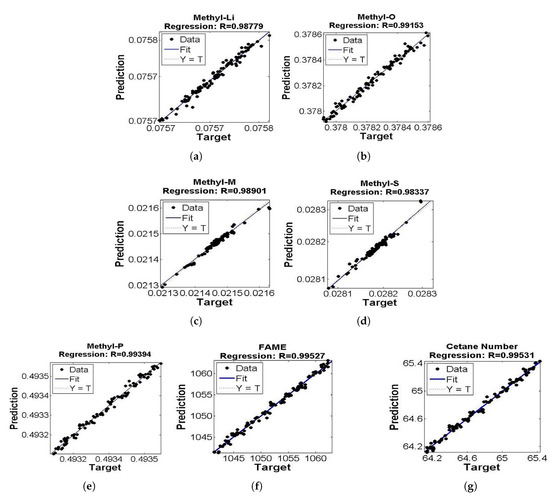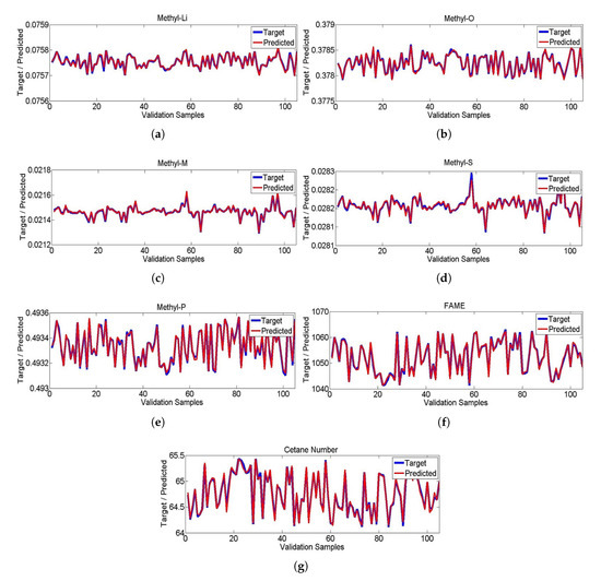 (a–g) Target and predicted values of Methyl-Li, Methyl-O, Methyl-M, Methyl-S, Methyl-P, Fame and Cetane number.