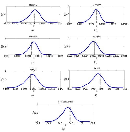 The non-intrusive PCE based predictive distributions of Methyl-Li, Methyl-O, Methyl-M, Methyl-P, and Methyl-S components, and FAME flow rate and cetane number are shown in Figure 7; the dotted gray lines show actual values of the respective components, while the blue lines show the PCE based predictive distributions. Actual values refer to the steady state values of the target variables of the process model. Table 5 shows mean absolute deviation percent (MADP) in the target variables of some selected validation datasets for 1% uncertainties in actual values of all input variables.