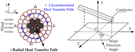 However, different zones of the conductor cross-section are differently influenced by forced convective heat and radiation heat transfer in actual operations as demonstrated in Figure 2. There are temperature differences between the windward, upper surface, leeward, and lower surface zones of the conductor cross-section.