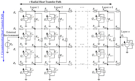 The physical variables in heat transfer have a similar correspondence with the physical variables in electricity. Thus, thermal-electrical analogy can be used to simulate the heat transfer process [31]. The conductor cross-section is divided into n layers (the nth layer is the central layer) in the radial direction. The heat loss generated by each layer of conductor is the heat source, and the heat transfer of heat flux in each physical layer can be equivalent to the thermal network. Where each physical layer is represented by a pair of R and C, to obtain the ETN by considering the radial and circumferential heat transfer paths of the conductor cross-section, as depicted in Figure 3.