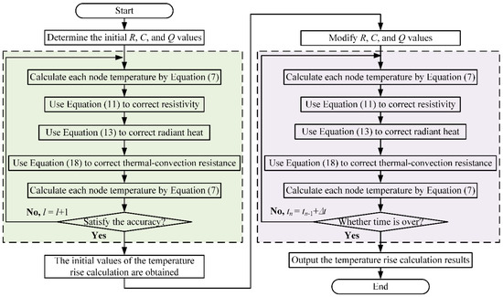 On the basis of the derivation of the above-mentioned parameters in the ETN, the following factors must be considered in solving transient temperature: (a) convective thermal resistance and radiant heat are the functions of temperature difference between fluid and solid interfaces; (b) conductor resistivity is related to temperature, and Joule heat is the function of temperature. Therefore, nonlinear iteration is adopted to solve the time domain response of the ETN. The concrete steps are exhibited in Figure 4.