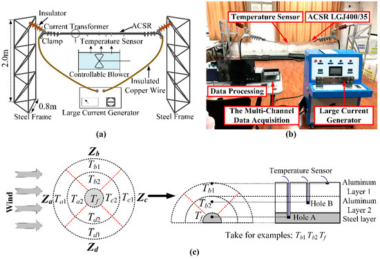 The tested conductor is divided into three layers (n = 3), and temperature monitoring probes are installed in the conductor surface, aluminum layer, and steel layer in Za–Zd, as is shown in Figure 5c. Taking Tb1, Tb2, and Tf for examples, three temperature measuring points (Tf in hole-A, Tb2 in hole-B, Tb1 on the surface) are placed at equal intervals along the axial direction. The internal temperature sensors are attached by drilling a small hole (its diameter is smaller than 1.2 mm) through the aluminum and steel layers. The temperatures of the conductor are collected by platinum film resistance temperature probes (PT1000) and uploaded to PC computer via the multi-channel data acquisition unit with the sample frequency of 50 Hz.