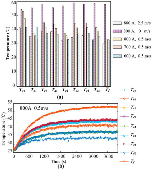 Figure 6 presents the temperature distribution and the difference of temperature rise response of the conductor under experimental conditions.
