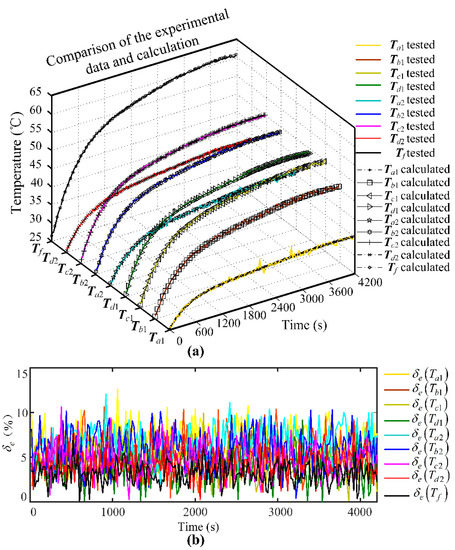 Figure 7a illustrates the comparison of temperature results obtained by the calculation method and test. The calculated curves are basically consistent with the test curves. Furthermore, in order to make quantitative analysis on the difference between tested and calculated, absolute relative error δe and average absolute relative error δavg are defined in Equation (19), where m is the total number of samples: