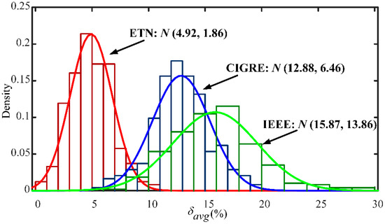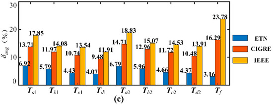 In the same experimental condition, the calculated results of the ETN are compared by adopting the IEEE and CIGRE standards [17,18]. The average absolute relative error δavg of the conductor steel core and aluminum layer are plotted in Figure 7c.