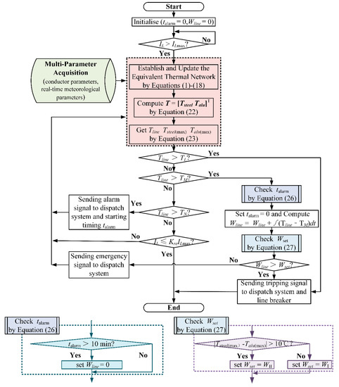 The electrical and mechanical properties, strength loss, and sagging of overhead transmission lines during overloading are influenced by conductor temperature and overload duration [8,9,10]. The conductor temperature can be a more accurate reflection of the safety condition of transmission lines than current. Two main approaches based on conductor temperature are used to characterize the overload degree of the line. The first one is by gathering real-time data from conductor temperature measuring devices installed on the line as the operating criterion for overload protection [11,12]. The second is by adaptively adjusting the setting value of protection delay time based on a dynamic thermal line rating (DTLR) calculation model [13,14,15,16].