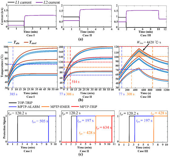 Simulation results of transmission line protection in three cases. (a) Current results; (b) temperature in different zones of the conductor cross-section; (c) Action signals of the MPTP and TOP.