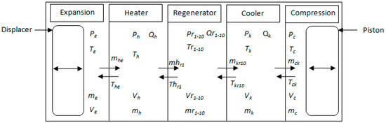 where represents the mass flow rate from the compression space to the cooler; is the temperature from the compression space to the cooler; is the temperature of the compression space; represents mass flow rate from heater to expansion space (kgs−1); is the temperature of the mass flow from the heater to the expansion space; is the temperature of the heater; and is the temperature of the expansion space.