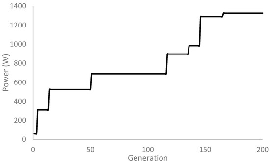 According to the optimisation procedure, the solution of the objective could be achieved with the selected constrained range (upper and lower limits) of design parameters in Table 3 by using an adequate global search method; hence, the consideration of the GA to optimise the design parameters of the FPSE so as to maximise the power output. Figure 4 shows the variation in the indicated power of the engine over the stipulated number of generations. The termination criterion was achieved at the 180th generation; however, the indicated power increased significantly from the first few generations.