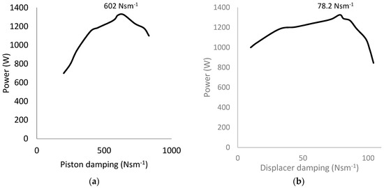 (a) Indicated power vs. piston damping; (b) Indicated power vs. displacer damping.