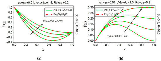 In the above-mentioned system of Equations (23) and (25), represents a dimensionless squeeze number, while, is the modified Hartman number and is the dimensionless parameter. Moreover, the radiation parameter is denoted by . Prandtl number is symbolized by . Besides, signifies, the Schmidt number. The chemical reaction is indicated by .