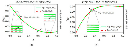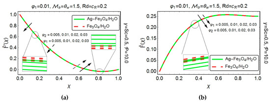 The goal is to graphically elucidate the influential behavior of velocity, temperature and concentration profiles, due to the various ingrained entities. A pictorial view, from Figure 2, Figure 3, Figure 4, Figure 5, Figure 6, Figure 7, Figure 8, Figure 9, Figure 10, Figure 11, Figure 12, Figure 13, Figure 14, Figure 15, Figure 16, Figure 17, Figure 18, Figure 19 and Figure 20, has been presented for the above-mentioned purpose. Figure 2, Figure 3 and Figure 4 displays the performance of velocity profile, under the action of the squeezing parameter, Modified Hartmann number and solid volume fraction. The variations in velocity component , due to squeezing parameter , have been depicted in Figure 2a. For , i.e., when the upper plate moves in the downward direction, the fluid nearby the upper wall experiences a force, which in turn enhances the fluid velocity in that region. As increases sufficiently, the velocity component also increases and gradually depreciates the reversal behavior of the flow. The velocity component also experiences an increment in the region, adjacent to the upper wall, which is mainly due to the squeezing behavior of the upper plate and this phenomena has been clearly observed through Figure 2b. Figure 3 demonstrates the impact of Modified Hartmann number on the axial and normal components of the velocity distribution. Since the magnetic field experiences an exponential decline, therefore velocity component seems to be increased in the lower region of the channel. The fact behind is that the application of magnetic field generates the Lorentz forces, which in turn opposes the fluid flow. But in the present situation, the magnetic field decreases, so the Lorentz forces decreases and consequently, an increment in velocity has been perceived in the region close to the lower Riga plate. Besides, in the upper half, the velocity displays an opposite behavior as compared to the lower half of the channel, which may be due to the downward squeezing motion of the upper plate. Figure 3b exhibits an increment in the normal component of velocity with the increasing Modified Hartmann number, which is primarily be due to the decreasing effects of Lorentz force. It can be detected from Figure 4a that the axial velocity decreases in the lower region with the increasing nanoparticles concentration, while an opposite behavior has been perceived in the upper portion of the channel. The reason behind is that the nanoparticle’s concentration resists the fluid to move and therefore decreases the fluid velocity. Figure 4b depicts a decline in the normal component of the velocity with increasing nanoparticle’s concentration, which opposes the fluid motion. Moreover, the inset pictures reveal the fact that the velocity for the nanofluid mostly attains the higher values as compared to the hybrid nanofluid.