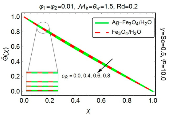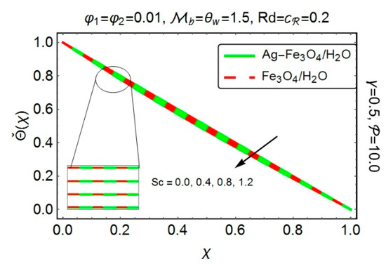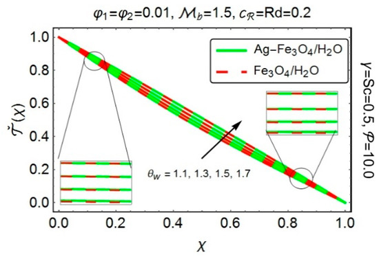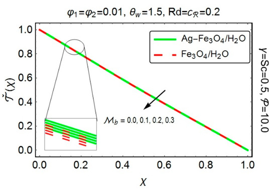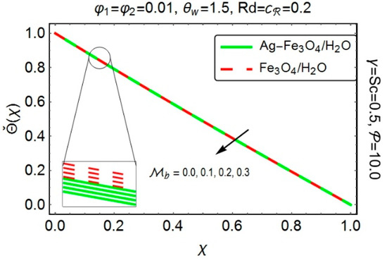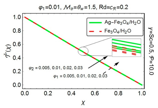 In all the above expressions, and simultaneously, represents the volume concentration of magnetite and silver nanoparticles in hybrid nanofluids. The viscosity, density and specific heat of host fluid are respectively denoted by and . At constant pressure, and respectively, denotes the specific heat of magnetite and silver nanoparticles. The densities, of magnetite and silver nanoparticles, are specified by and respectively. and represents the thermal conductivity and mass diffusivity of the water . The thermal conductivities of magnetite and silver nanocomposites, are respectively symbolized by and .