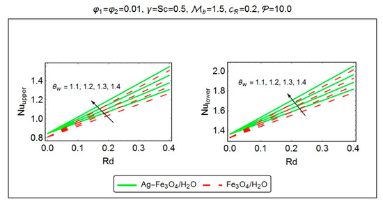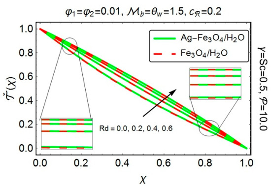 Figure 8 has been sketched, to highlight the temperature behavior under the influence of radiation parameter . An upsurge has been encountered in temperature, for increasing . The fact behind is that, the increasing corresponds to the decrement in mean absorption coefficient, which in turn raises the fluid temperature. The temperature also depicts a rising behavior with increasing (see Figure 9). The increasing implies that the temperature differences between the lower and upper walls significantly rises and subsequently, an increment in temperature has been recorded.