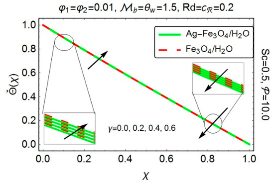 The upcoming figures give a pictorial description of the variations in temperature distribution, for various embedded parameters. Figure 5 displays the impact of squeezing parameter on temperature profile. When the upper plate squeezed down, i.e., , it exerts a force on the nearby fluid and enhances its velocity, but since the temperature seems to be dominant at the lower wall therefore the fluid in the adjacent region experiences the higher temperature values as compared to the region nearby the channel’s upper wall. To demonstrate the impact of Modified Hartmann number on temperature distribution, Figure 6 has been plotted. It has been found that temperature reveals lower values, as increases. As the impact of Lorentz force on velocity profile produce a friction on the flow, which mainly be responsible to produce more heat energy. In the present flow situation, since the magnetic field exponentially decreases, so the Lorentz force decreases which in turn generates less friction force and consequently, decreases the heat energy and therefore decreases the fluid’s temperature as well as the thermal boundary layer thickness. From Figure 7, one can clearly observe an increment in temperature profile with increasing nanoparticles concentration. The fact behind is that, the inclusion of nanoparticles with different volume fractions augments the thermal properties of the host fluid and therefore increases its temperature. It has also been observed that the temperature of hybrid nanofluid shows its supremacy over the nanofluid, which definitely be due to the rising values of the thermal conductivity for hybrid nanofluid.