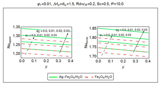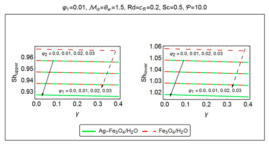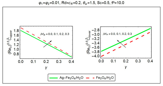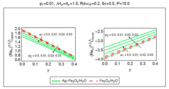 The next set of figures provide us an aid, to visualize the deviations, in concentration profile, caused by various embedded parameters. Figure 10 demonstrates the influence of squeezing parameter on the concentration profile. When the upper plate moves vertically downward, i.e., , it suppresses the adjacent fluid layers and enhances its velocity, but since the concentration shows its supremacy at the lower wall, therefore the concentration profile shows its dominancy in the region, close to the lower wall, as compared to the region adjacent to the upper wall. To demonstrate the impact of Modified Hartmann number on concentration profile, Figure 11 has been painted. As explained earlier that the Lorentz forces, in present flow situation, experience a decline, which as a result generate less friction force and therefore, decrease the concentration profile along with concentration boundary layer thickness. From Figure 12, one can clearly detect a decline in concentration profile, as nanoparticle fraction increases. Moreover, it has been noticed that the concentration profile for hybrid nanofluid possesses lower values as compared to the nanofluid.