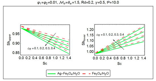 Subsequently, by incorporating Equations (6) and (31) into Equation (30), we finally achieved the dimensionless forms of skin friction, the Nusselt number, and the Sherwood number, both at the top and bottom walls, which can be expressed as: