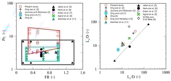 Comparison of the presented work’s results with other experimental studies from the literature: (left) Prandtl number vs. fill ratio, and (right) the dimensionless area ratio in the evaporator Le/D vs. the dimensionless area ratio in the condenser Lc/D.