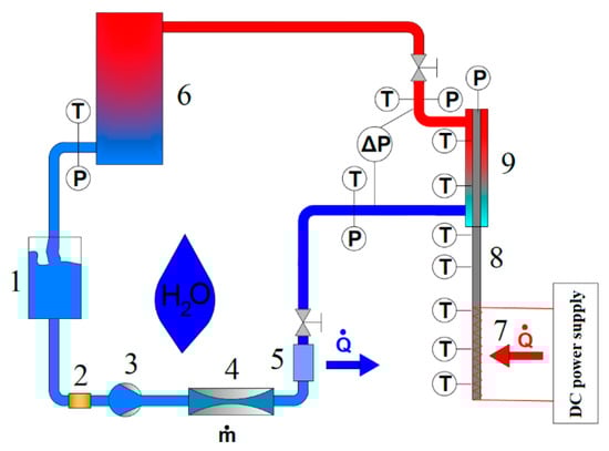 Experimental work has been used to find an improved version of the test section, which has been characterized in previous works [19,20]. The test rig consisted of a closed loop made of stainless steel. The facility was intended to work with any non-chemically aggressive working fluids. In the test rig, circulation was forced using a magnetic gear pump, capable of providing a mass flow rate from 1 g/s to 5 g/s, and an overpressure of up to 8 bars. This type of pump was chosen to provide the circulation of fluid in the test section and to avoid flow pulsations. Adjustment of the mass flow rate was realized using an independent inverter. The mass flux, and inlet and outlet temperatures of the cooling water were measured. The unit was also equipped with an additional heat exchanger in the main tank. This was used to provide additional heating or cooling of the medium depending on the needs. Temperature, mass flow, and system pressure were recorded using a data logger connected to a computer. The data are display using LabView 8.0 National Instruments (Austin, TX, USA) [21]. The flow rate was measured using a Coriolis mass flow meter (Endress Hauser Promass). The advantage of this device is the simultaneous measurement of mass and density of the pumped liquid. The pressure drop measurement was carried out at the cold-water circuit using the piezoelectric smart differential pressure transmitter. Microprocessor control enabled temperature and hysteresis compensation, and it also allowed for an extended linear temporal stability. The measuring range of the transmitter was 5 kPa to 500 kPa, and the measuring accuracy was ±0.065%. At the inlet, the absolute pressure transducer was mounted and had a measuring range of 0–4 bar and a precision of ±0.25%. At the outlet, the gauge pressure transducer was installed and had a range of 0–6 bar and an accuracy of ±0.5%. The operating pressure inside of the TPCT was also measured using a gauge pressure transducer with the range of −1 bar to 2.5 bar and an accuracy in full scale ±0.5%. The hydraulic deadweight testers were used to verify the calibration of pressure sensors in order to confirm their class and to check the linearity. Each sensor was calibrated for the entire measurement range. The inlet and outlet temperatures of cold water were measured using two PT100-resistant temperature sensors (1/3 DIN B class of tolerance—it is not a standardized class of accuracy) inserted at the inlet and outlet collectors. Other temperatures in the test sections and wall temperature of thermosyphon were measured using J-type thermocouples with first class accuracy (the type of thermocouple made of iron-constant wires; the working range of this thermocouple is between −40 °C and 750 °C). All temperature sensors were calibrated for the entire measuring range (with the allocation of each sensor to a specific channel on the SCXI-1303—32-channel isothermal terminal block). An Isotech 935-14-61 RTD (resistance temperature detector) sensor was used as a reference thermometer. In combination with the Cropico 3001 micrometer, it offered an accuracy at the level of ±0.1 K. The power was supplied to the evaporation section using electric heater. The heater was made of kanthal electric wire insulated using glass wool. This heater has been supplied by a DC power supply. The evaporation section was thermally insulated by rock wool. The rest of the test section was insulated using thermaflex insulation. The scheme of the test rig is shown in Figure 2.
