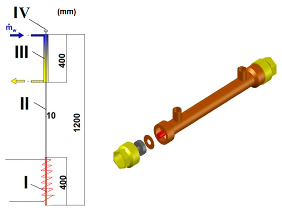 Obtained construction of wickless heat pipe: (left) geometrical characteristic of thermosyphon (I—evaporator section, II—adiabatic section, III—condenser section, and IV—Schrader valve); (right) construction of the heat exchanger used as a condenser.