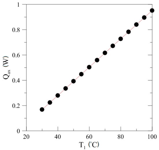 The calculations were made for a constant cold end of the pipe (T2 = 15 °C) and a variable temperature T1 of the hot end of the pipe (30 °C to 100 °C). It should be noted that the range of temperature differences was assumed as a maximum temperature change between evaporation (hot end) and condensation section (cold end). Calculations results are presented in Figure 5. The maximum calculated heat flux was no larger than 1.0 W. Finally, considering the results of calculation, influences of the axial conduction heat transfer was neglected.