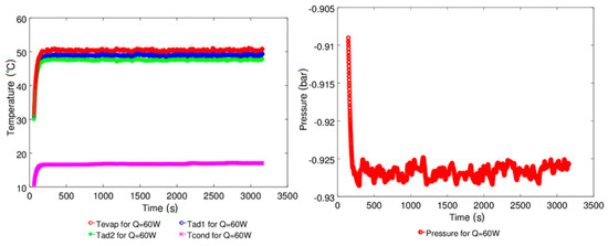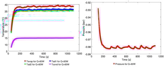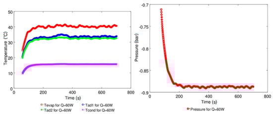 Working parameter variation as a function of time for a TPCT filled with distilled water at a filling ratio of 0.51 and heat load of 60 W: (left) temperature profile; (right) Gauge pressure profile.